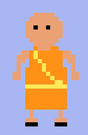 I looked up the definition of absolute zero: the lowest temperature that is theoretically possible. My first two thoughts were ice, and space. An ice sliding sokoban is my first game idea. What if instead of a temperature, absolute zero was the goal? Like an bug exterminator in a maze. I’ve played with using genetic algorithms as maze solvers, and it would be cool if I could incorporate that somehow into the behavior of the bugs you have to exterminate. Maybe absolute zero could refer to needing to have absolute zero doubt. I could create some sort of law game where you play as the jury, with procedurally generated cases to adjudicate. Zero as a value factors heavily in binary. I could do some kind of platformer puzzle game that involves having to flip switches and logic gates to zero out some binary equation. What if the absolute in the theme meant absolute as in totality? Then absolute zero is complete nothingness. I could make a simple path walking game where you play a monk trying to achieve enlightenment. I liked that idea so much, I did a quick character mock up for the monk.