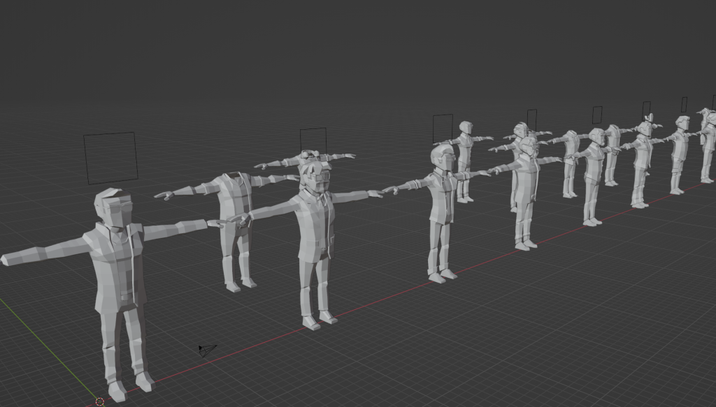 Once I have all the playable characters looking good enough for a first version, I make my first attempt at outputting the characters from Blender and getting them into the game. The FBX models I used from the asset packs were already rigged. But when I imported them into Blender, I must have done something wrong because the characters were just a messy ball of limbs that were all folded in on themselves. Since I’ve never done any rigging, the easiest way for me to solve that issue was to just delete the rigs. That let me work on the models, but now that I want to put them into the game, I’m going to need the rig I removed.